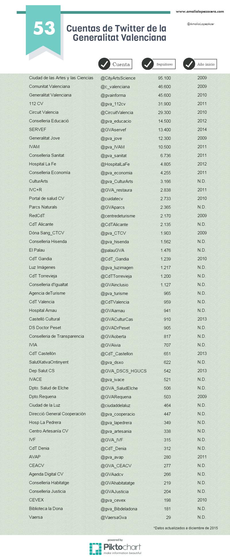 Aquí comparto con vosotros este listado que desde hace algún tiempo voy actualizando y que me permite tener una visión de conjunto de la presencia de los diferentes departamentos de la Generalitat Valenciana en esta red social.