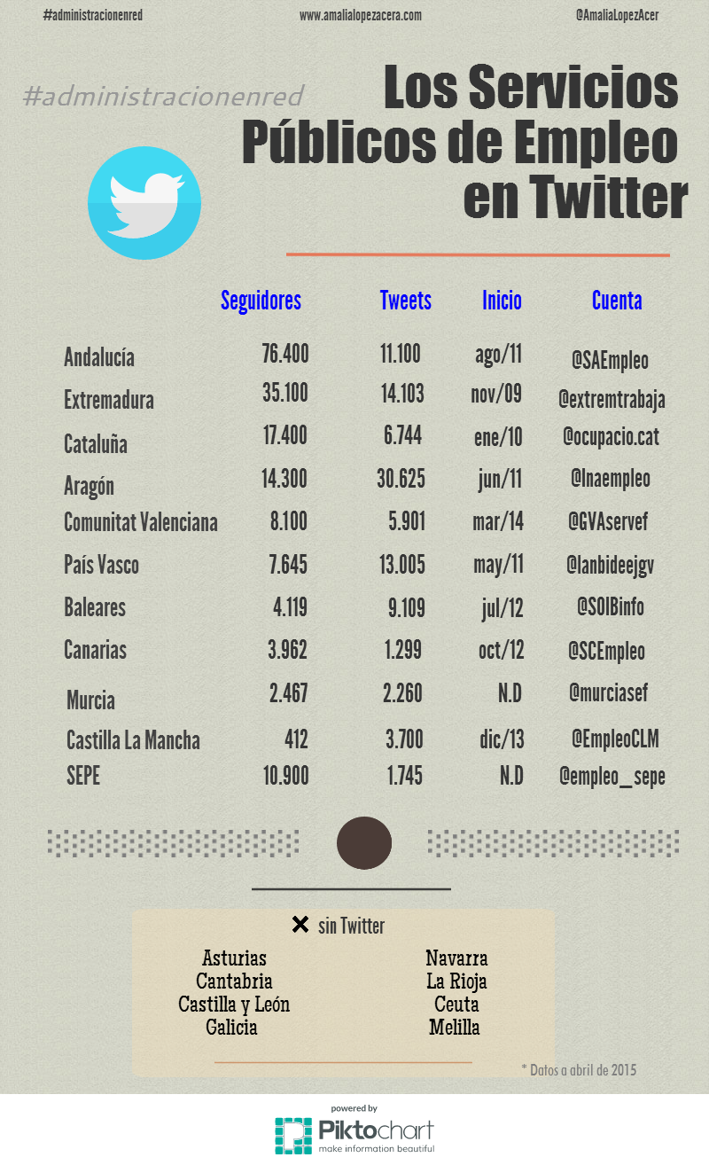 Allá por el mes de septiembre del año pasado elaboré una infografía en la que recogía diferentes aspectos sobre las cuentas que los servicios públicos de empleo autonómicos tienen en Twitter. Hoy, seis meses después, la he actualizado y la comparto con todos vosotros por si os interesa conocer cuál es la presencia en Twitter de estos organismos públicos.