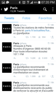 En esta imagen vemos el último tuit enviado por el Ayuntamiento de París antes de los atentados en que se hacía referencia a actividades para el fin de semana y cómo después se empezaba a dar información de interés para los ciudadanos. Las redes sociales por tanto pueden ser algo más que un entretenimiento o un pasatiempos, también pueden ser un canal de comunicación para que las autoridades públicas pueden hacer llegar información de servicio público a miles de personas de forma rápida, sencilla y económica.
