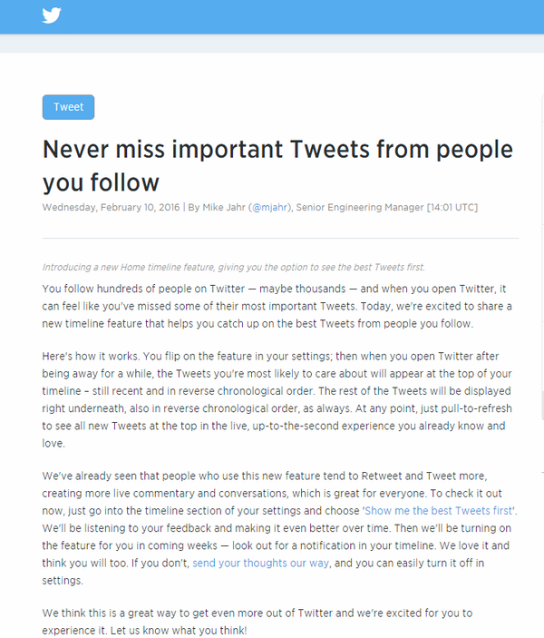 Hasta ahora se seguía un orden cronológico, es decir, los tuits más nuevos eran los que aparecían en primer lugar, y según íbamos descendiendo lo hacíamos marcha atrás en el tiempo. Pero con el cambio introducido hoy, cuando accedamos a nuestra cuenta de Twitter se nos mostrarán en primer lugar aquellos tuits consideramos más «relevantes», y a continuación el resto en orden cronológico.